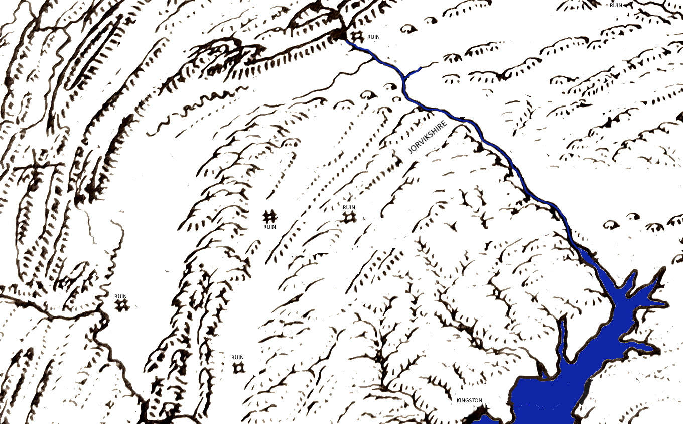 Centuries later, settlers fed up with serfdom and perpetual war in Europe create small pockets of civilization in North America. One “cash crop” of the English Kingdom (called the Kingdom of Nessex) is gold and artifacts taken from the remains of the Atlantean civilization, making adventuring a serious business. Our campaign opens in 1130 AD as our characters are recruited by the Earl of Jorvikshire, settled in the geography that would be York County, PA in our world.