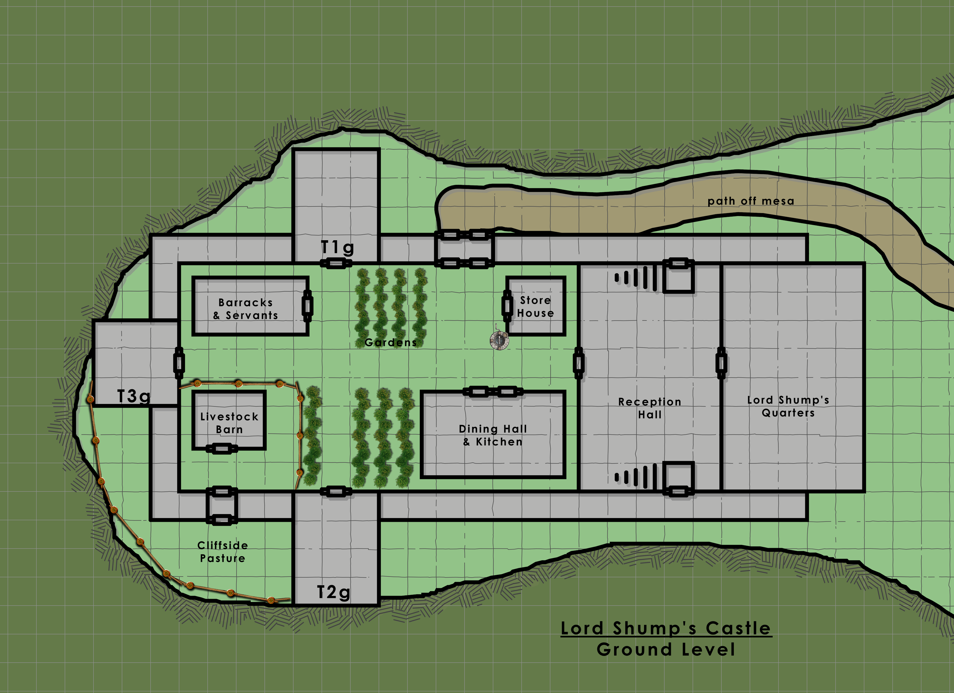 Lord Shump originally assigned the larger rooms, T1g and T2g for Renly and Giggles, as they have henchmen. T2a would be for Zerkwad and T1a for any quests. T3a and T3g for Mrow as room (lower) and workshop (upper). Castle Shump and its caretakers.